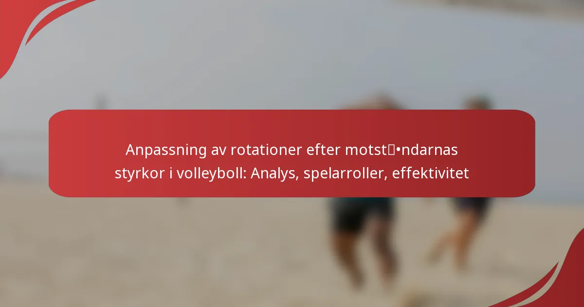 Att anpassa rotationer i volleyboll baserat på motståndarens styrkor innebär att analysera deras förmågor och justera spelarnas positioner för att utnyttja svagheter. Viktiga strategier inkluderar att bedöma motståndarens prestation, identifiera nödvändiga förändringar, genomföra taktiska justeringar och utvärdera effektiviteten av dessa modifieringar.